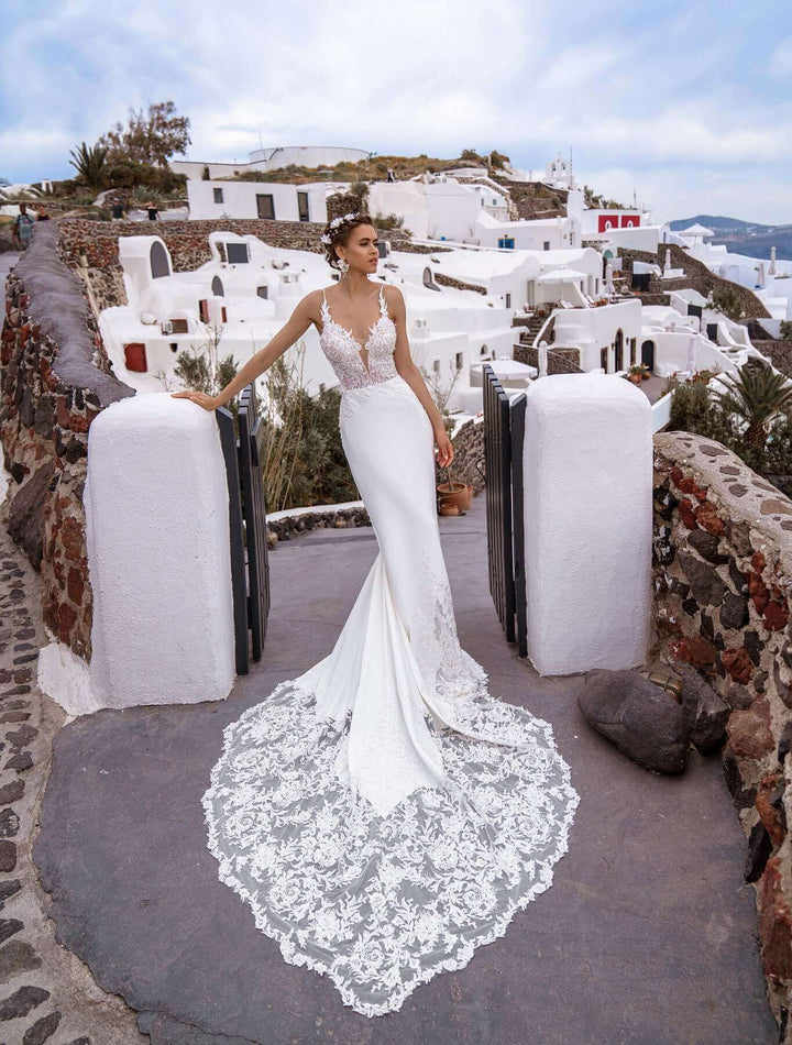 Beautiful wedding dress in fit and flare style with thin straps and cathedral lace train. Deep V neckline at the front and low back add sexiness to the dress.